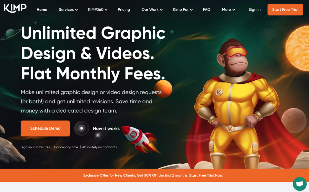 Kimp takes things up a notch by offering both graphic design and video services under one subscription. This is a great option for businesses that need visuals across multiple formats.