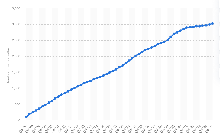 Here is a pictorial depiction of the number of monthly active Facebook users worldwide as of 2nd quarter 2023 (in millions):